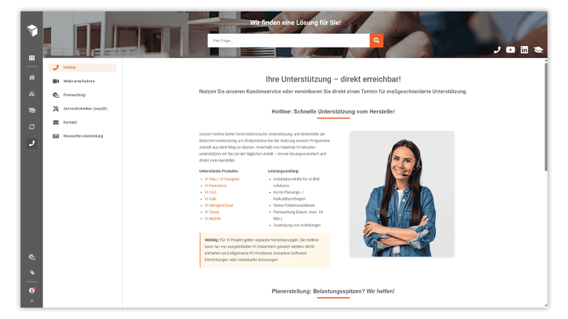 Die SERVICE-Seite bleibt im Vi Manager 4.0 in ihrer bewährten Form erhalten und bietet weiterhin Zugriff auf alle bekannten Service-Funktionen und Unterstützungsangebote.
